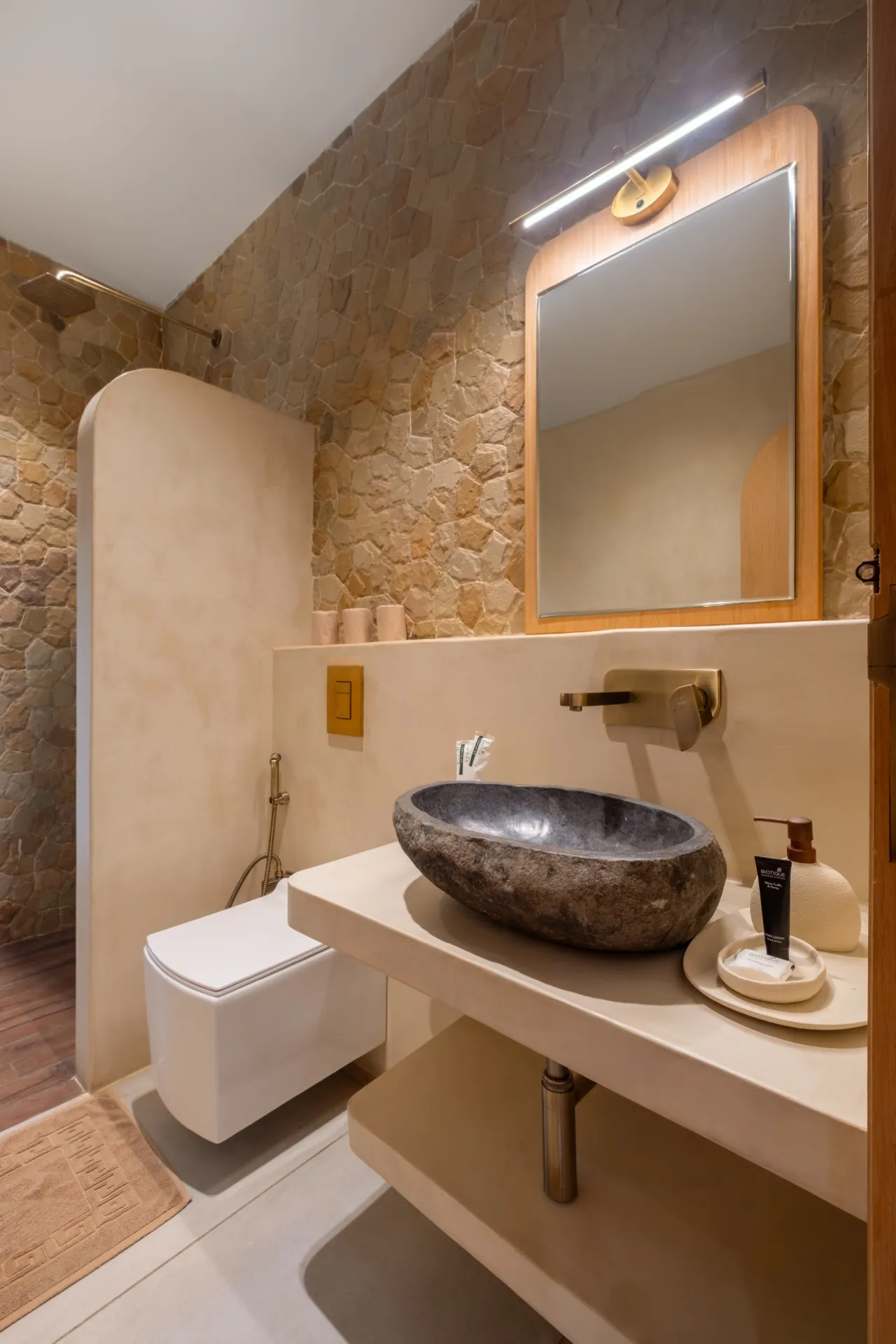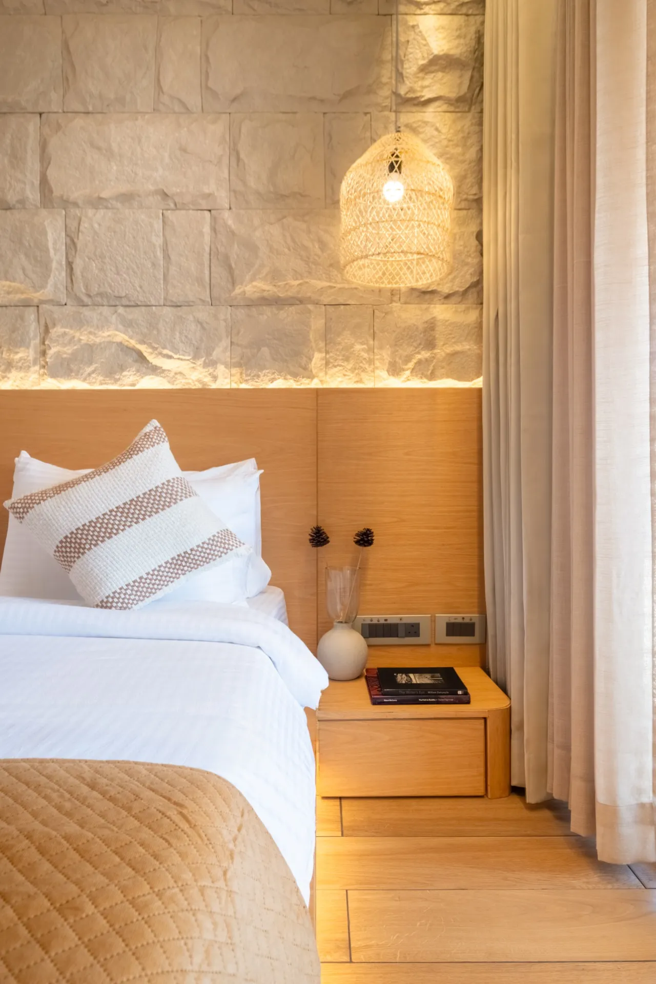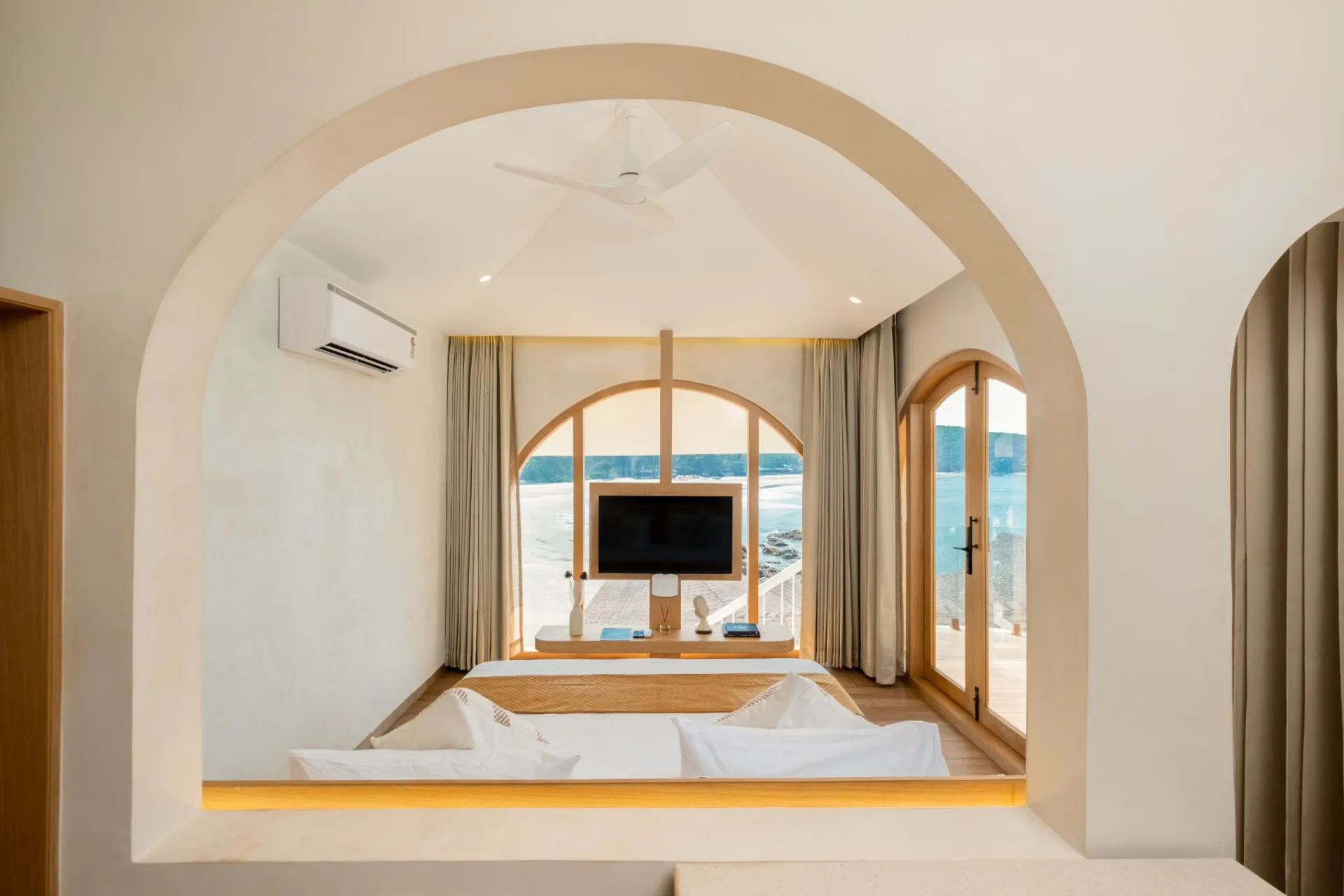 Perched to capture the full sweep of the Arabian Sea, our Sea View Room is a sanctuary of light and calm. Floor-to-ceiling archways frame the ocean, flooding the space with natural warmth from sunrise to sunset. Step onto your private balcony to watch fishing boats drift across the horizon, or settle into the plush king bed with the sound of waves as your backdrop. Every detail — from the hand-picked furnishings to the stone accent walls — has been chosen to echo the coastal beauty just outside your window.